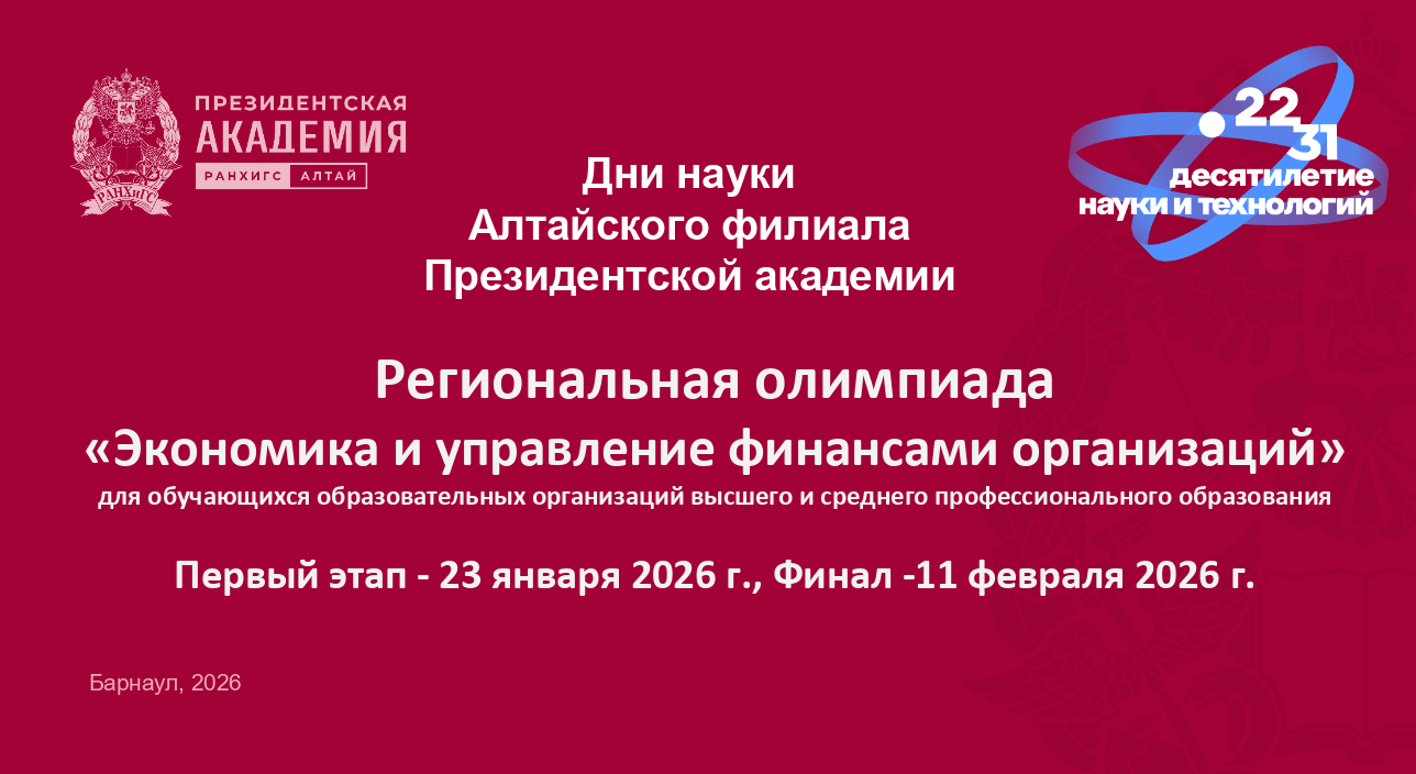 Контактные лица: Чубур Ольга Васильевна, Князева Ольга Михайловна. Телефон: +7(3852) 503-431, e-mail: fin@alt.ranepa.ru